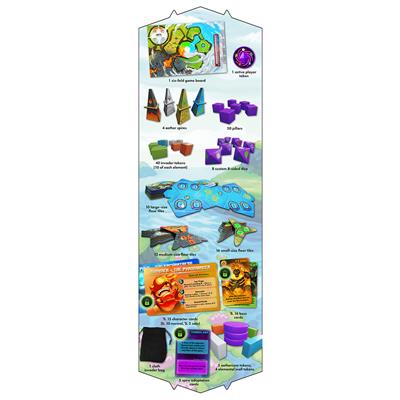 You and your companions will take on the role of Elementis heroes, working together to mold elemental power into four spires, one of each element: earth, air, fire, and water. A spire is a set of four floor tiles, one on top of another, all of the same element. Each time you complete a spire, that element’s aether fiend is defeated. Once all four aether fiends have been defeated, the heroes share in glorious victory, having restored balance to the realm of Elementis!