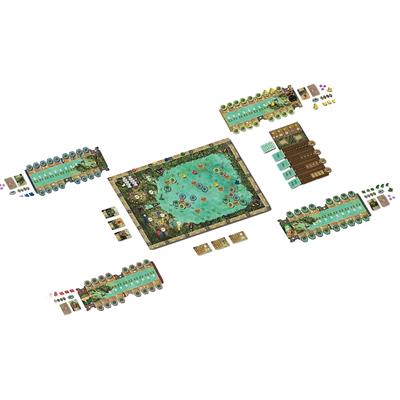 You take actions by moving your boats across the swamp, and these actions include fishing, trading with other clans, exploring abandoned temples in Feya, and building new settlements that will enhance your clan's abilities. Some actions don't require moving through the swamp, such as improving your navigation, which increases your boat speed; hosting festivals where each clan contributes fish to earn victory points; or building new cult spaces that bring prestige to the small islands that form in the swamp.